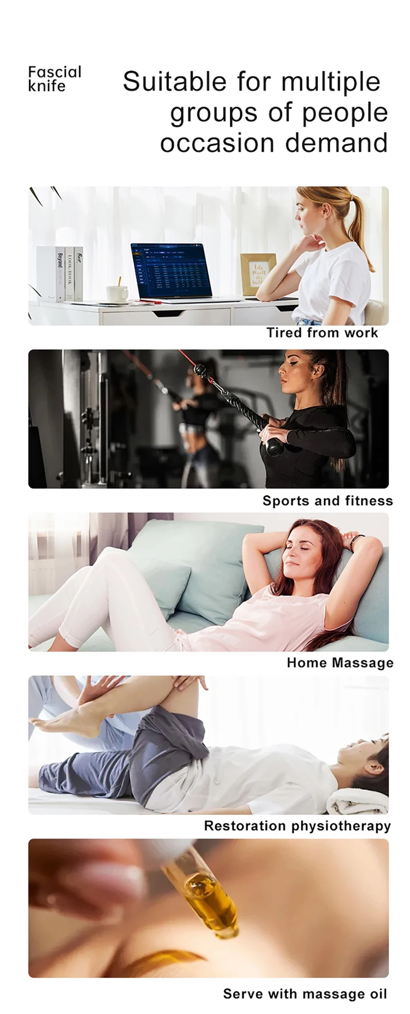 3. Multi functional massage tools for the whole body: Fascia massage tools are suitable for any part of the body and can effectively target the neck, arms, back, waist, thighs, legs, hands, shoulders, and joints, providing a comprehensive massage experience