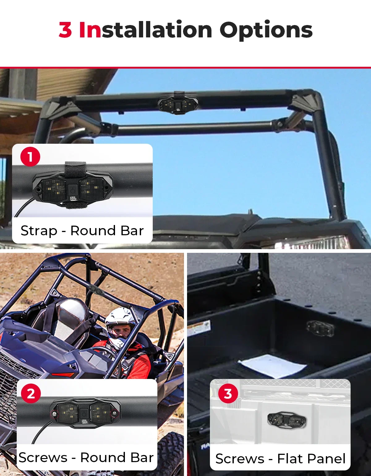 ①Use 15.7in adjustable strap and flexible rubber base to mount the cab light to most roll cages and roll bars. ②Use self-tapping screws to fix the light and base to most round cages and bars. ③Use screws to secure the LED light to the flat panel.